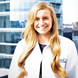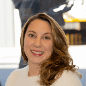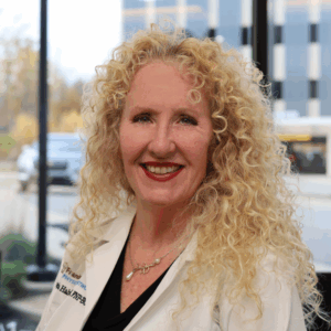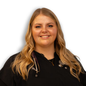 Sarah Neky, a healthcare professional with long brown hair, wearing black scrubs and gold jewelry, smiling against a white background.